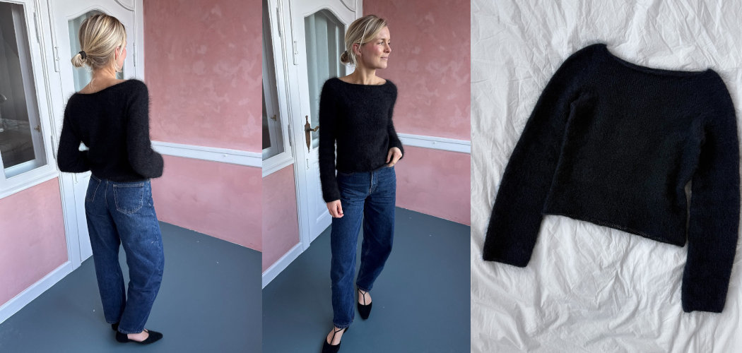 Блуза «Bea» вяжется без швов сверху вниз с вырезом горловины лодочкой. По горловине выполняются укороченные ряды для поднятия ростка спинки. Кокетка формируется сначала прибавками для рукавов, а затем прибавками для реглана. Тело вяжется по кругу лицевой гладью. В конце вяжутся рукава.