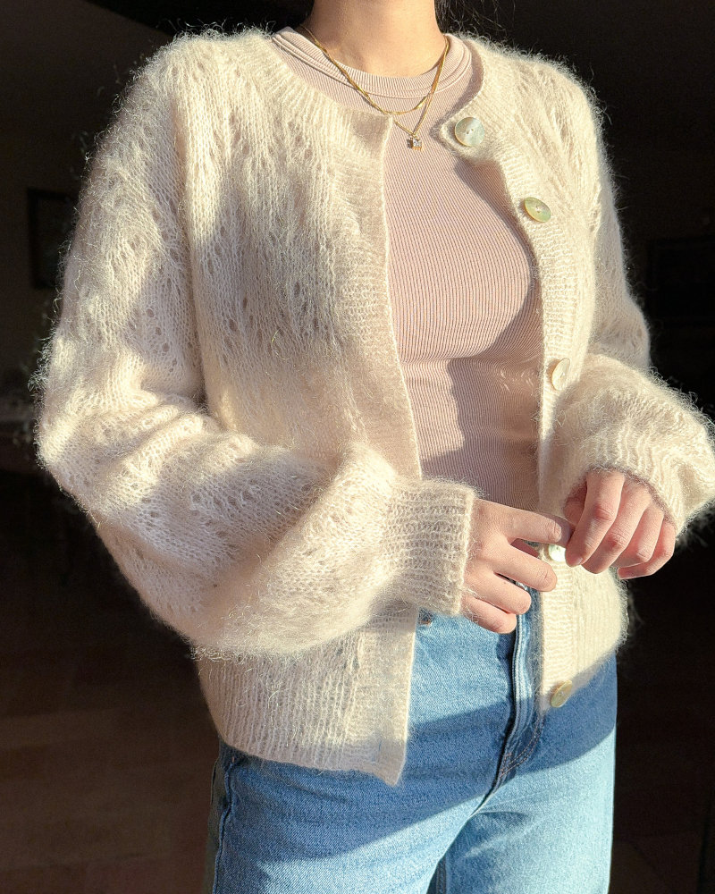 Кардиган Som вяжется в 2 нити тонкого мохера сверху вниз ажурным узором. Сначала вяжется кокетка спинки укороченными рядами ажурным узором, формируя скос плеча. Затем для каждого плеча поднимаются петли вдоль кокетки спинки и вяжутся поворотными рядами. После того, как плечевые детали будут готовы, спинка и плечи соединяются и вяжутся поворотными рядами до нижнего края. Для рукавов поднимаются петли по пройме, затем формируется окат укороченными рядами. Остальная часть рукавов вяжется по кругу и завершается пышным силуэтом. Наконец, планки застежки вяжутся резинкой вдоль передней части и горловины.