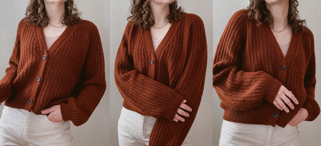 Кардиган Mara — это классический кардиган-реглан на пуговицах, связанный простой ломаной резинкой, свободного кроя, с изящной планкой застежки и рукавами-баллон.
