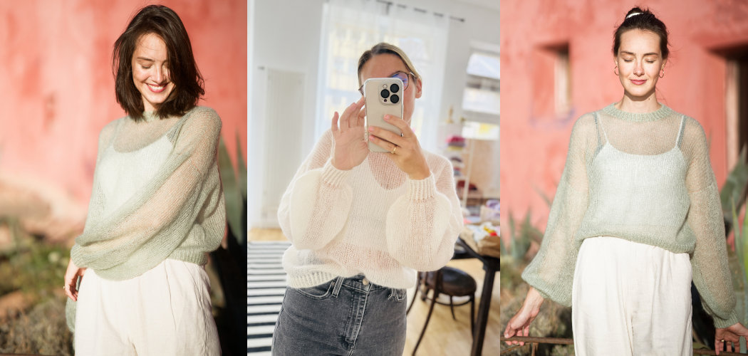 Свитер имеет свободную, воздушную посадку оверсайз. Сочетание тонкой пряжи-паутинки с более крупной вязкой создает воздушную, летнюю и легкую текстуру. Манжеты, нижняя планка и воротник связаны в две нити, что создает интересный контраст с легким и блестящим полотном основной части и рукавов. Этот пуловер идеально подойдет для теплых летних вечеров в сочетании с топом, платьем или просто поверх бикини для похода на пляж.
