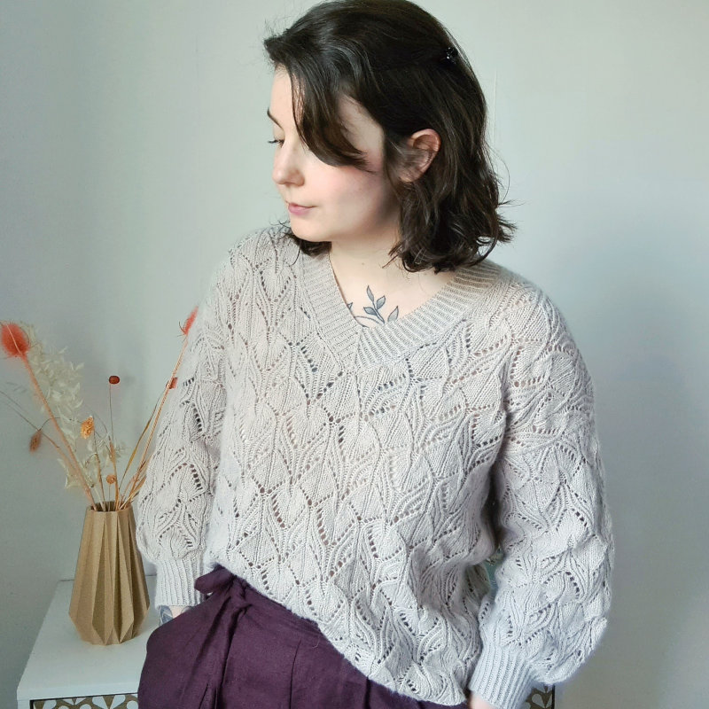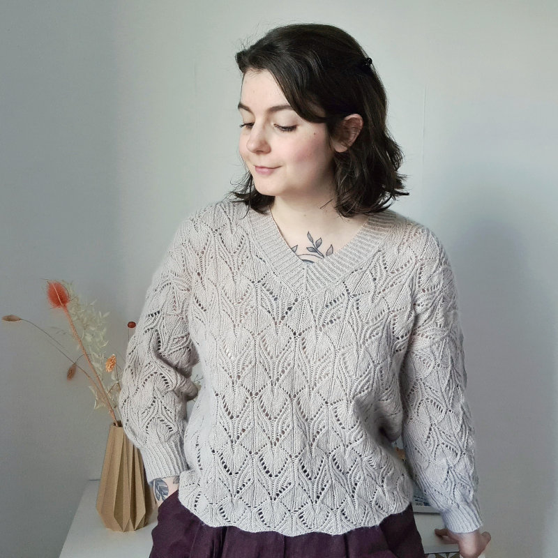 Oleander — это полностью ажурный пуловер со спущенным плечом и V-образным вырезом горловины. Вяжется снизу вверх, создавая изящное воздушное изделие со скрещенной резинкой. Интуитивно понятный ажурный узор полностью дан на схемах для всех деталей, что делает этот пуловер доступным для любителей ажура.
