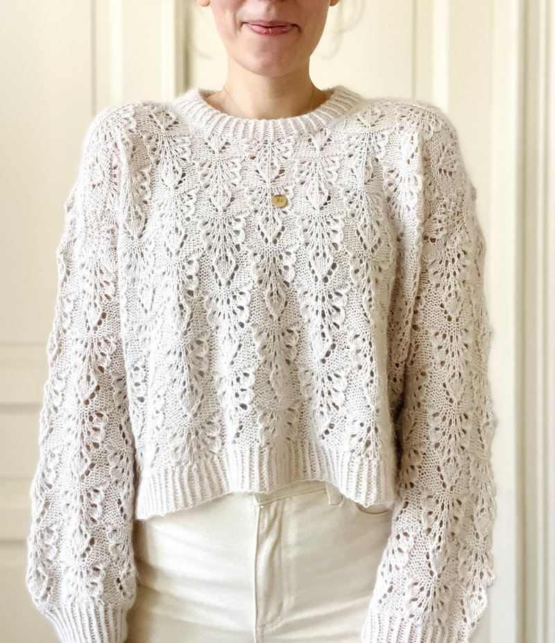 Пуловер вяжется ажурным узором сверху вниз одной деталью. Сначала вяжется спинка до проймы привлекательным ажурным узором. Затем передние детали вяжутся отдельно, подняв петли вдоль плеч спинки. Для формирования круглого выреза горловины, выполняется несколько прибавок после первых 3 петель и перед последними 3 петлями на лицевой стороне. Затем передние детали соединяются, и передняя часть вяжется одной деталью, пока она не достигнет той же длины, что и спинка перед окончанием проймы. Далее спинка и передняя часть соединяются в круг, чтобы тело можно было закончить ажурным узором по кругу. В зависимости от размера ажурный узор расширяется на новые петли подреза проймы — или нет (но это не будет видно в конечном изделии). Тело завершается скрещенной резинкой 1×1.