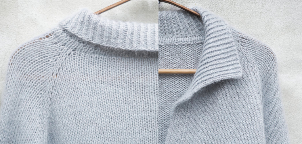 Простой пуловер с открытым воротником-поло. Он вяжется спицами сверху вниз, взяв вместе 1 нить мериноса + 1 нить мохера на шелке.