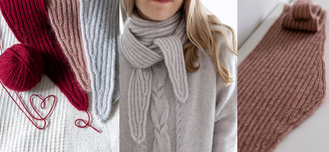 Merino от Knitting for Olive (100% меринос, 250 м = 50 г), цвет Pearl Gray для серого шарфа и Rose Clay для розового шарфа.