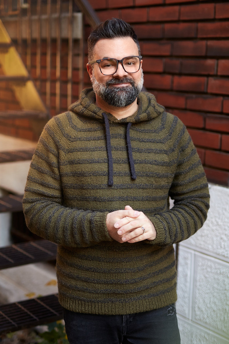 Мужское худи вязаное спицами сверху вниз с формированием регланом.