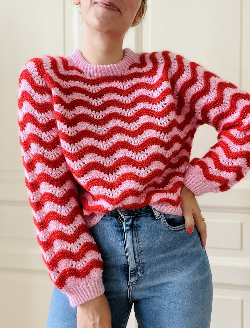 Свитер вяжется классическим регланом сверху вниз одной деталью. Сначала вяжется кокетка волнистым узором поворотными рядами для формирования круглой горловины. Затем, когда работа будет соединена в кольцо, кокетка вяжется с прибавками реглана и волнистым узором по кругу. После того, как рукава будут отделены, тело заканчивается одной деталью без каких-либо прибавок с нижней планкой, связанной основным цветом скрещенной резинкой 1×1. Затем возвращаются в работу петли рукавов, и рукава вяжутся до желаемой длины также волнистым узором. Незадолго до манжет выполняется несколько убавок для придания рукаву формы баллон. В конце рукава вяжутся манжеты основным цветом скрещенной резинкой 1×1. И наконец, поднимаются петли по вырезу горловины и вяжется двойная планка скрещенной резинкой 1×1.