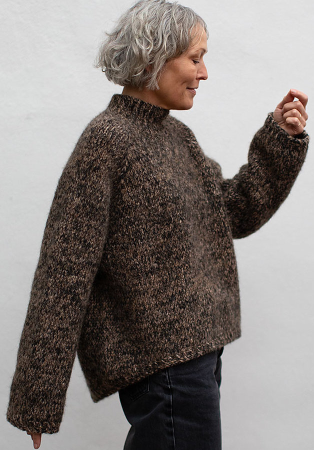 JILLI JAM — уютный свитер реглан с такими деталями, как скрещенная резинка и плавно изогнутый нижний край. Свитер имеет свободный крой и стандартную пройму. Вяжется сверху вниз без швов. Сначала выполняется планка горловины, затем укороченными рядами поднимается росток спинки, и, наконец, свитер вяжется по кругу сверху вниз вдоль кокетки, тела и рукавов. Внизу тела укороченными рядами формируется изогнутый нижний край.