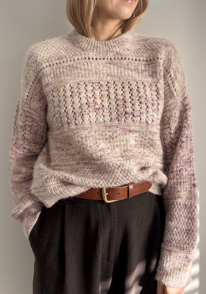 Свитер Maude – это изящный свитер с разнообразными текстурами и ажуром. Несмотря на то, что свитер выглядит сложным, каждая «секция» включает в себя легко запоминающийся узор с раппортом из 4 рядов, поэтому нет необходимости следовать сложным схемам.