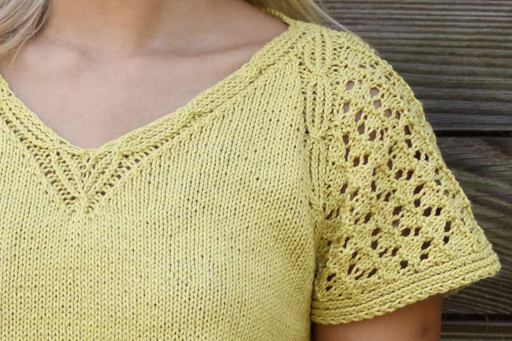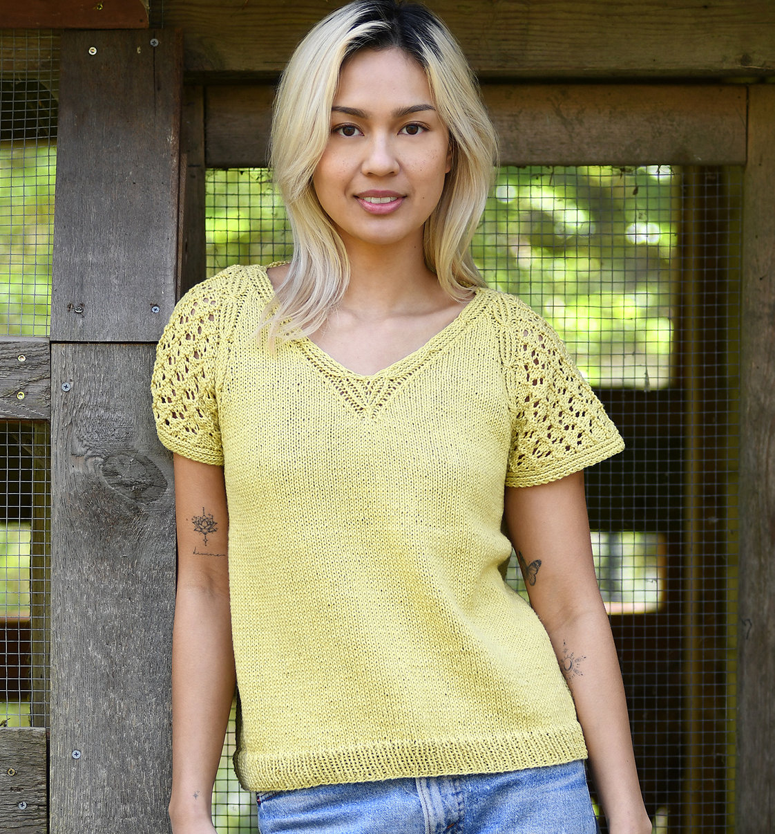 Этот топ вяжется по кругу снизу вверх, затем работа делится на переднюю часть и спинку, которые продолжаются отдельно. Для создания ложного реглана используются узор с косами из ажура и скрещенной резинки. Плечи формируются укороченными рядами и соединяются методом 3-х спиц.