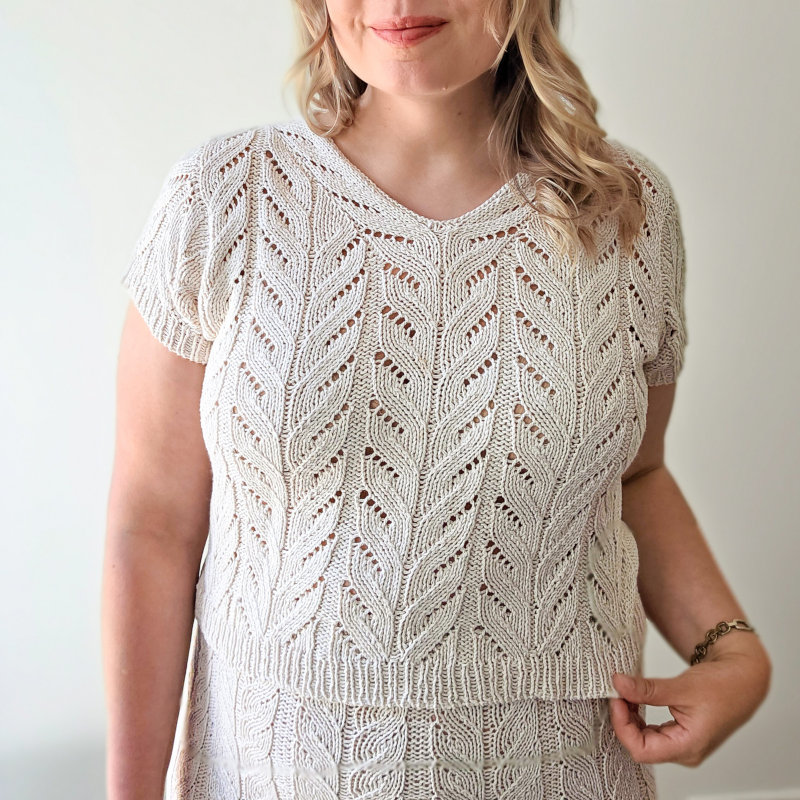 Топ Ebba вяжется без шов сверху вниз ажурным узором, напоминающим косы. Ажурный узор повторяет форму горловины передней части, а затем соединяется внизу V-образного выреза. Прибавки ажурного узора полностью отображены на схеме.