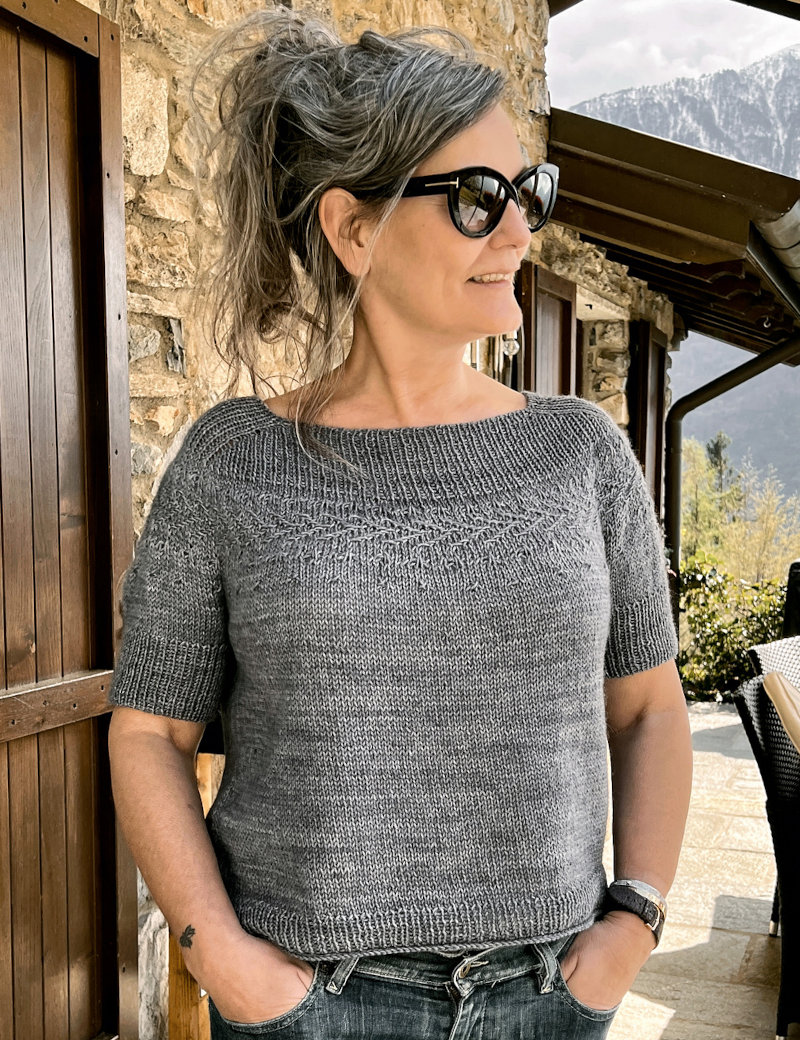 Короткий топ с припуском 5-10 см на свободу облегания. Топ с короткими рукавами и широкой резинкой по вырезу горловины, расширяющейся на счет прибавок. На кокетке топа фактурный текстурный и мозаичный узор, а также немного вышивки после вязания.
