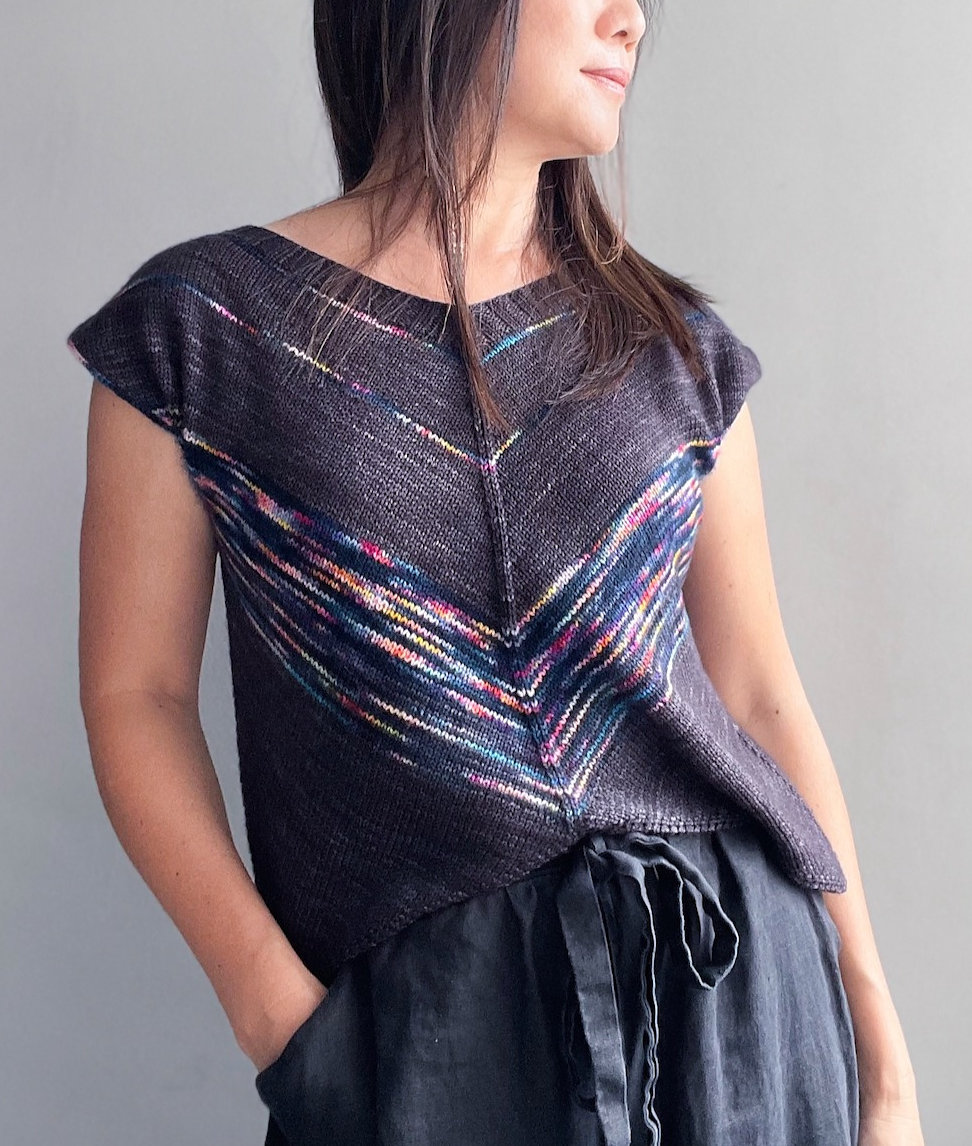 Топ вяжется снизу, начав с альтернативного набора ярлычком платочной вязки. Прибавления выполняются (аналогично вязанию шали), пока сложенный треугольник не достигнет половины ширины топа. Изготавливается вторая подобная деталь, и обе детали образуют нижние клинья топа.