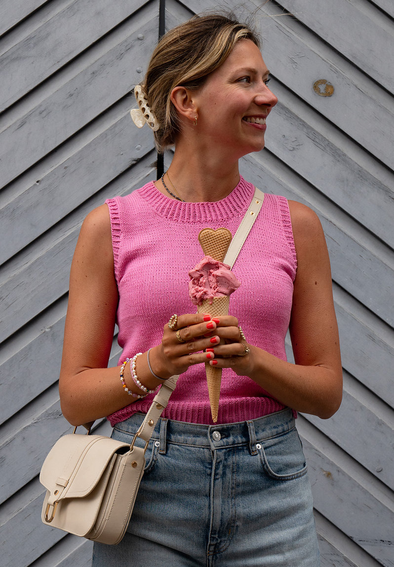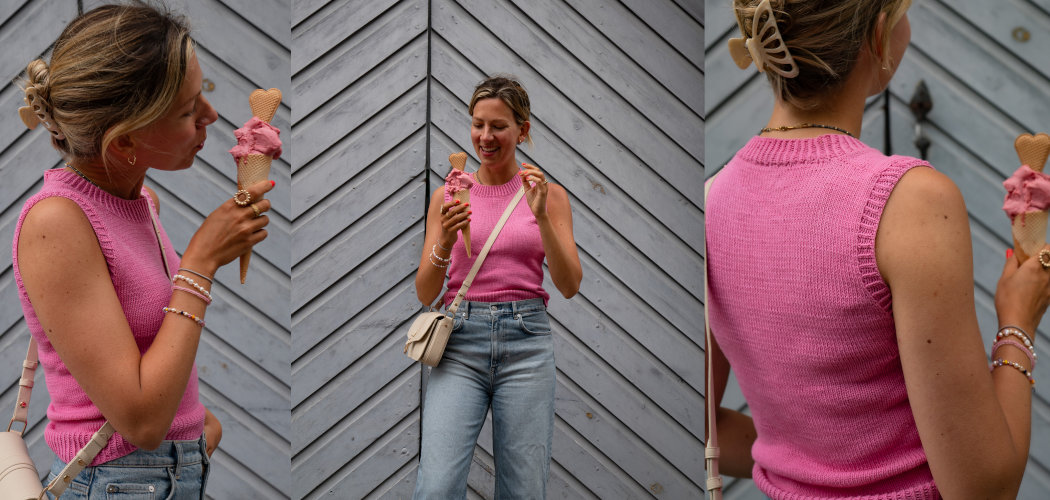 Топ Sweet Breeze — это простой и современный топ, который вяжется сверху вниз без швов. Это базовая вещь летнего гардероба, которую удобно носить благодаря широким плечам и высокому воротнику — вам не будет слишком жарко, и вам не придется беспокоиться о том, что будут видны бретельки бюстгальтера — беспроигрышный вариант! Это легкий и простой проект, связанный лицевой гладью — приятно сидеть и вязать, потягивая холодный напиток или мороженое на солнышке.