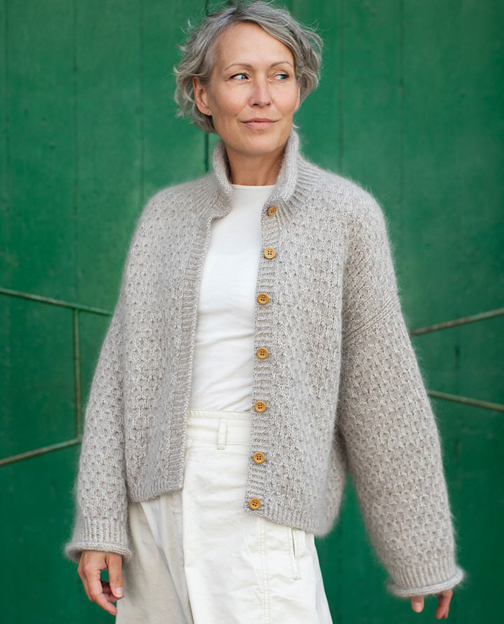 Жакет HONEY вяжется сверху вниз без швов. Сначала вяжется кокетка спинки. Затем поднимаются петли вдоль плеч для секций полочек. Спинка и обе полочки соединяются внизу проймы и вяжутся поворотными рядами одной деталью. Затем поднимаются петли для планки горловины, которая вяжется поворотными рядами. То же самое относится и к планкам бортов полочек. Планка горловины заканчивается скрученным в рулик краем. Наконец, поднимаются петли для рукавов, которые вяжутся по кругу сверху вниз.